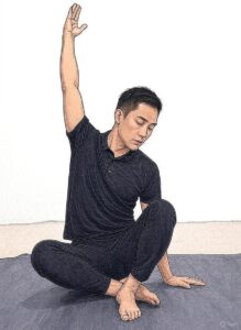 - 右手を耳の横から上に向けて体側を伸ばします。
