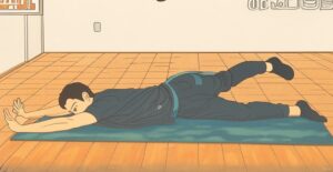 - 仰向けになった状態から股関節と膝を90℃に曲げて横向きになります。